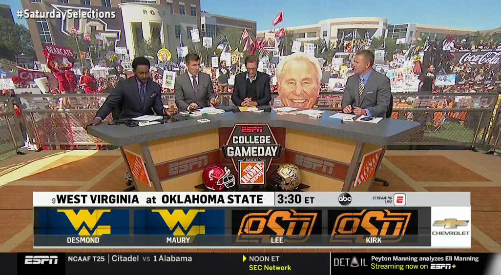 Lee Corso and Kirk Herbstreit cast their votes in favor of the Pokes, while, Desmond Howard and guest picker Maury (!) picked the Mountaineers. Maury, a known quarterback guru, had this to say: “How can they [West Virginia] not [win]? I think they’ve got maybe the best quarterback in the country!”
