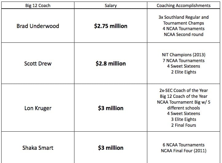Based on this, Underwood was asking/received Scott Drew money. The Big 12 league average for coaches salary is a bit inflated, but four out of 10 coaches have been to a Final Four and every coach has made an NCAA Tournament.